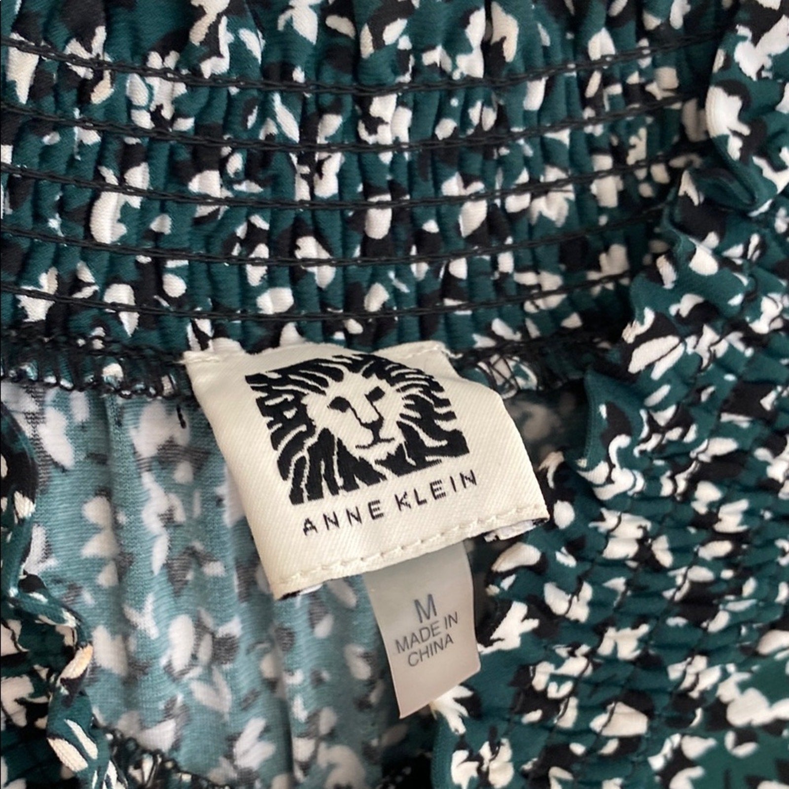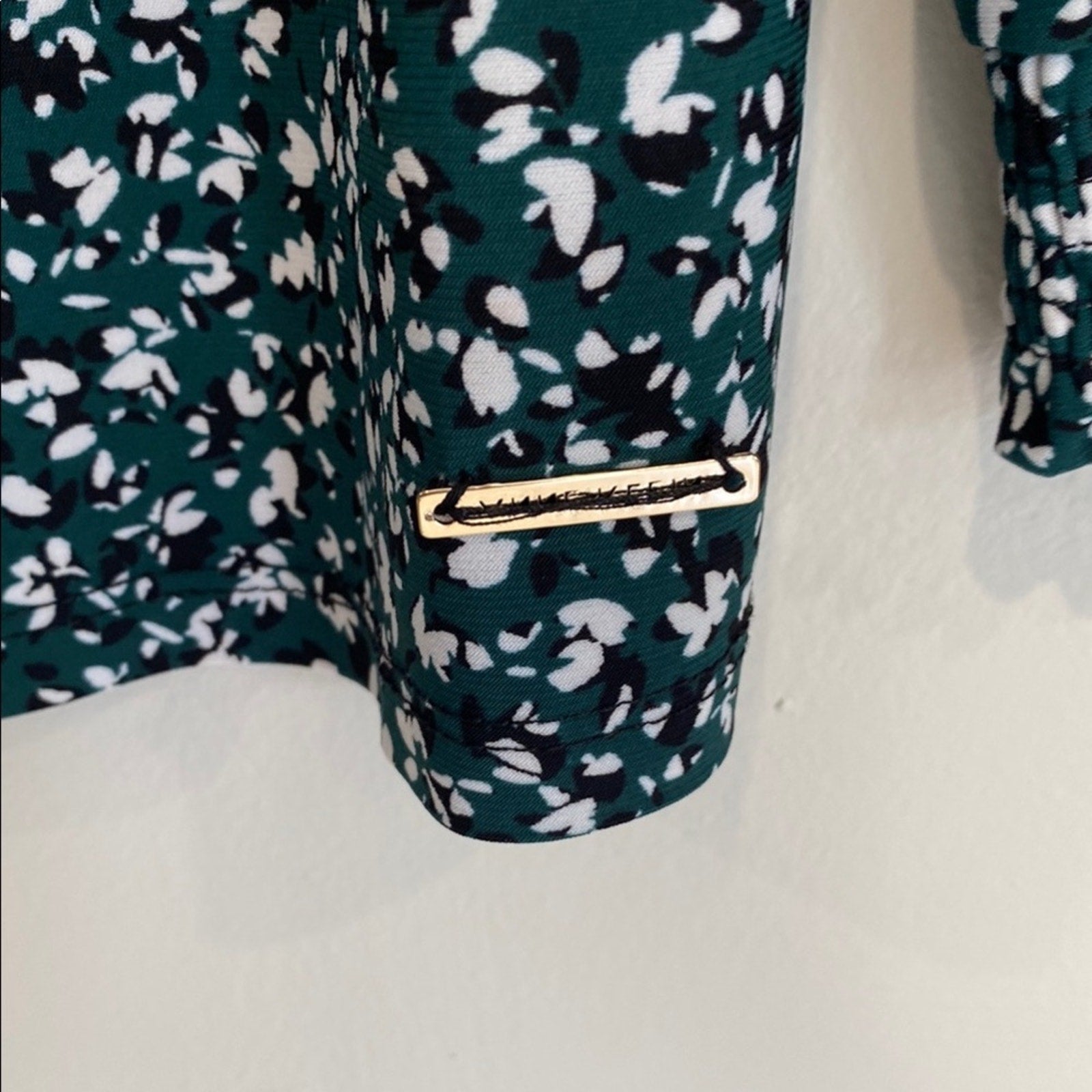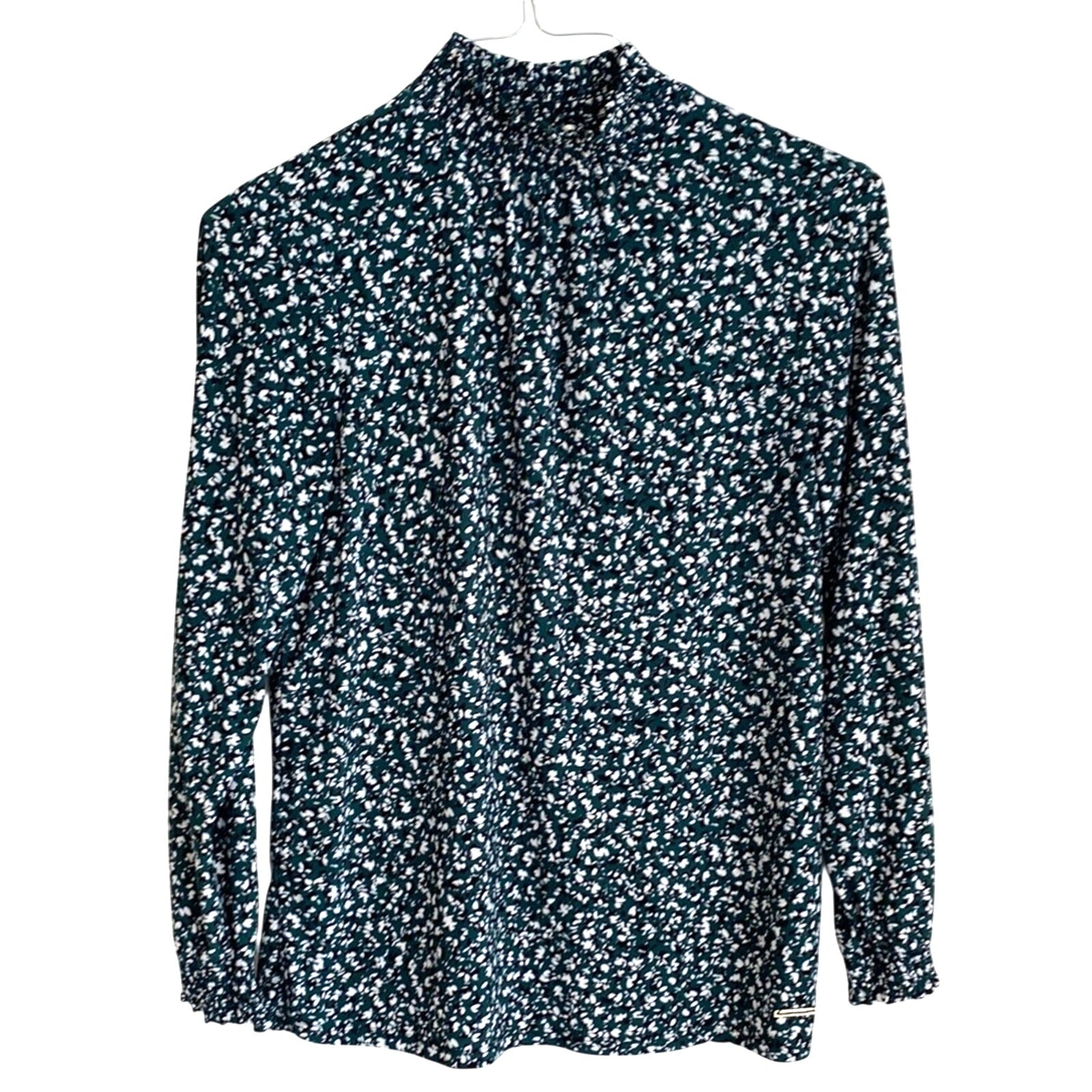 This elegant Anne Klein blouse features a sophisticated black green and white design with a mandarin collar and 3/4 sleeves. The buttoned front adds a touch of classic style, making it a versatile addition to any wardrobe. Perfect for both professional and casual settings, this blouse offers a timeless look with its refined silhouette.