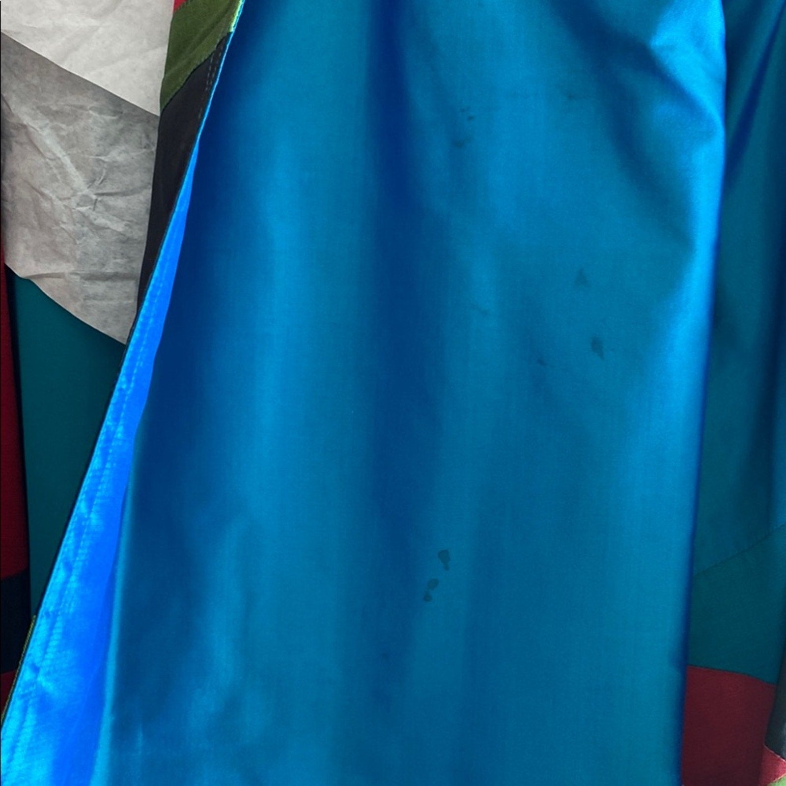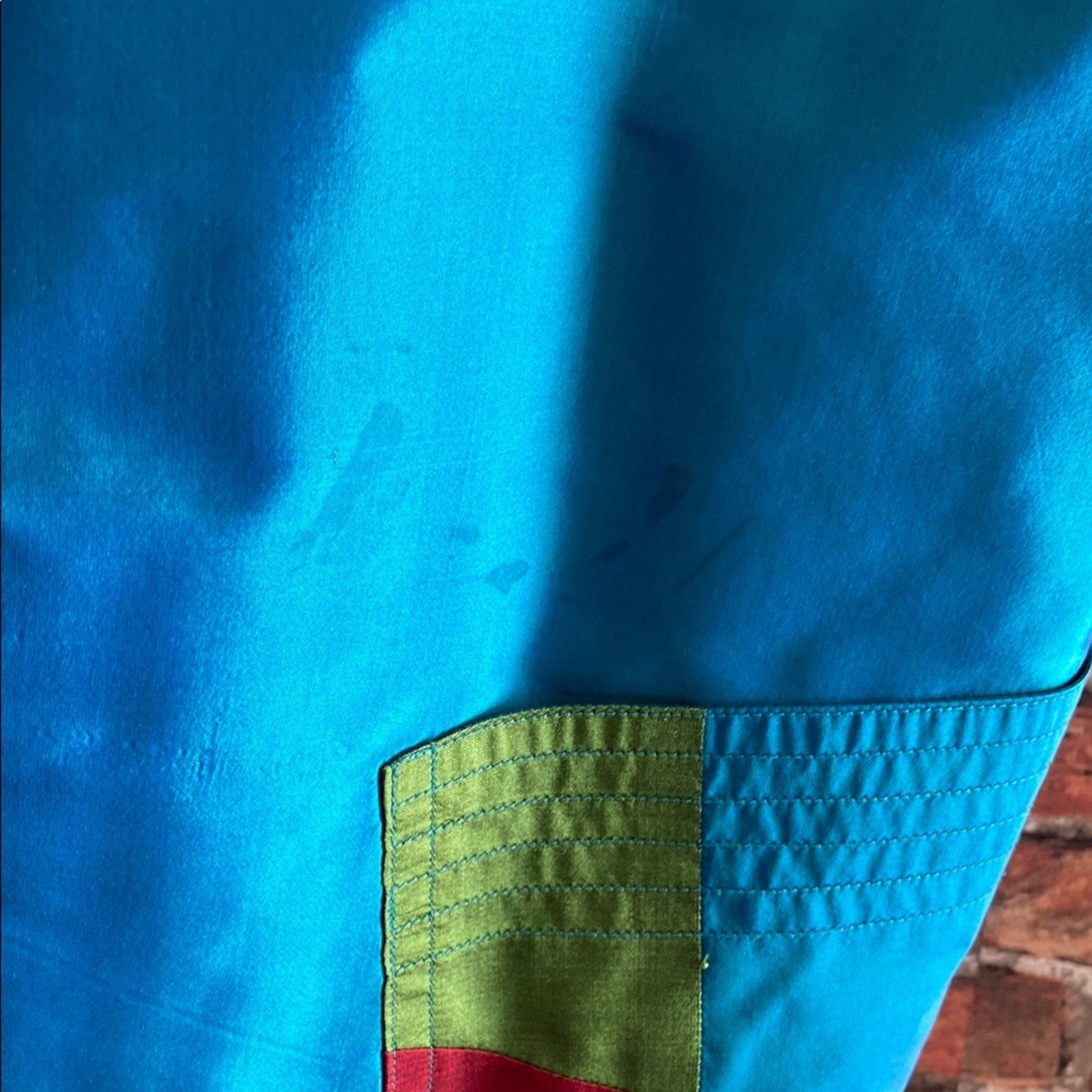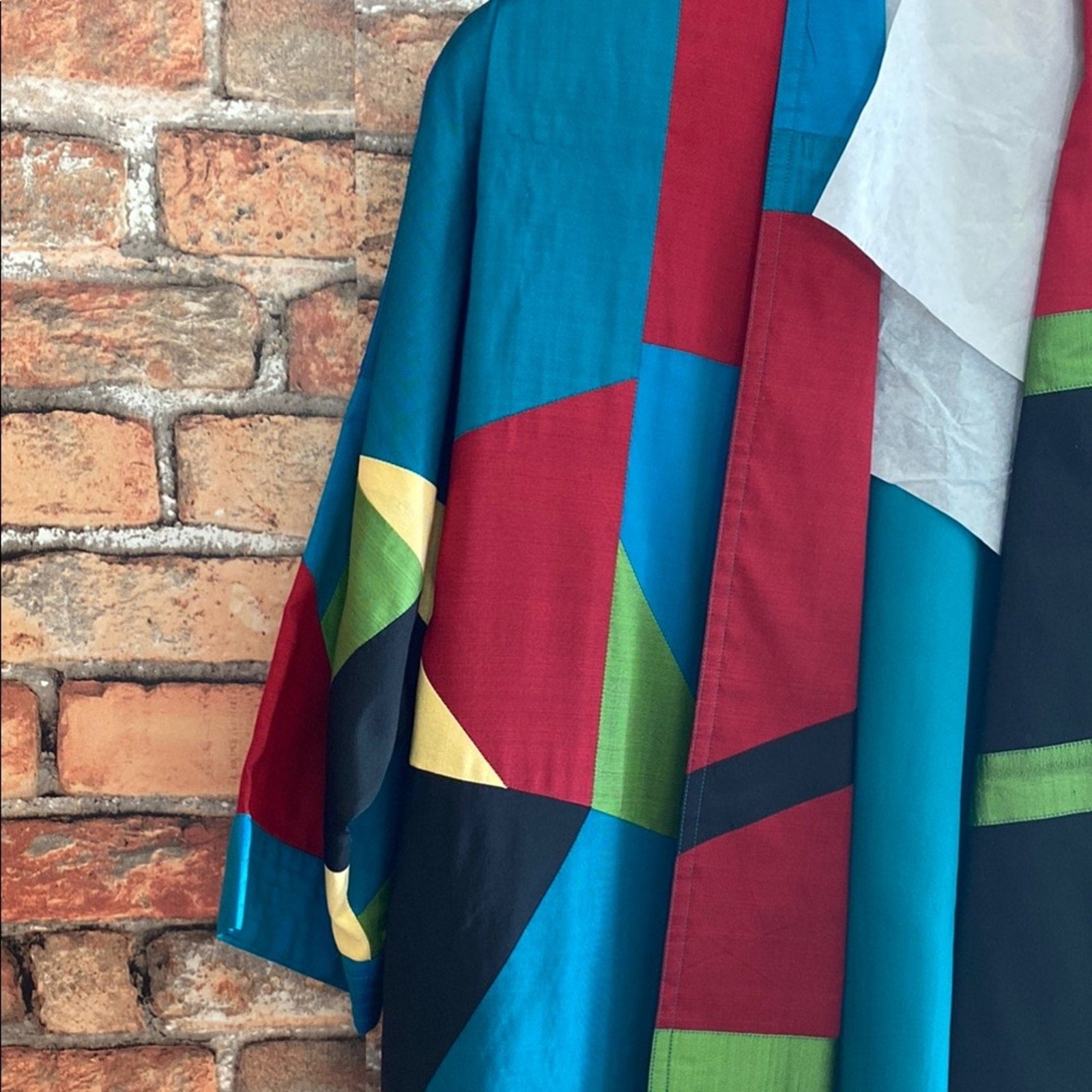 This Thai Silk casual button-down shirt features a striking geometric pattern in blue and red, perfect for adding a modern touch to your wardrobe. The soft fabric and artistic design make it ideal for casual outings or relaxed gatherings. Embrace a retro vibe with its bold color combinations and unique style. Some spots as pictured. Fits like an XL.