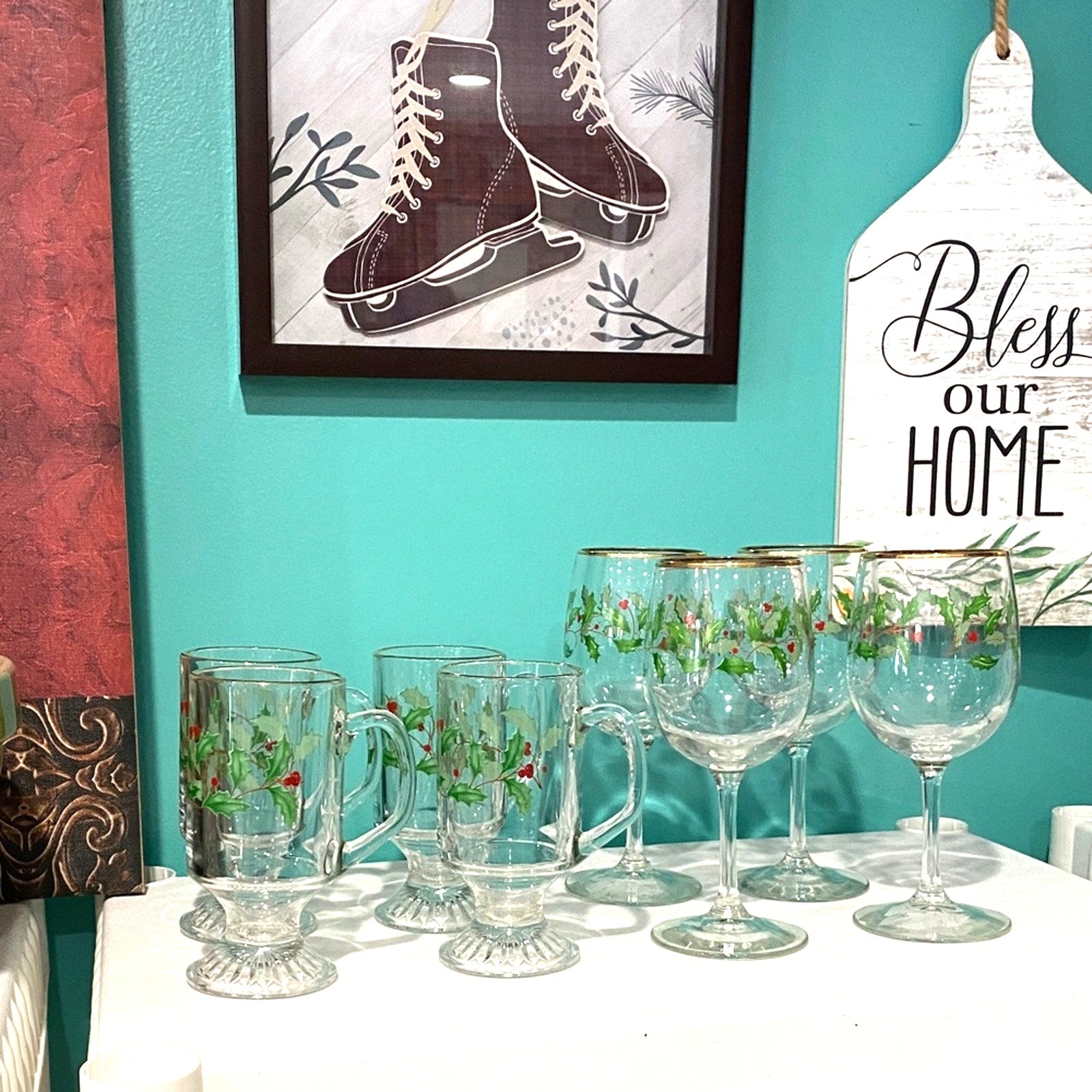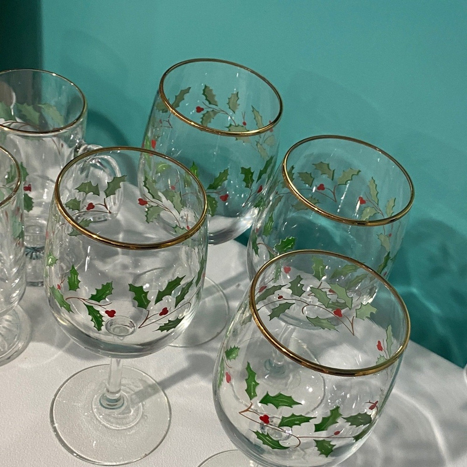 Charming glassware with holly design. Accented with gold trim. Ideal for holiday celebrations.